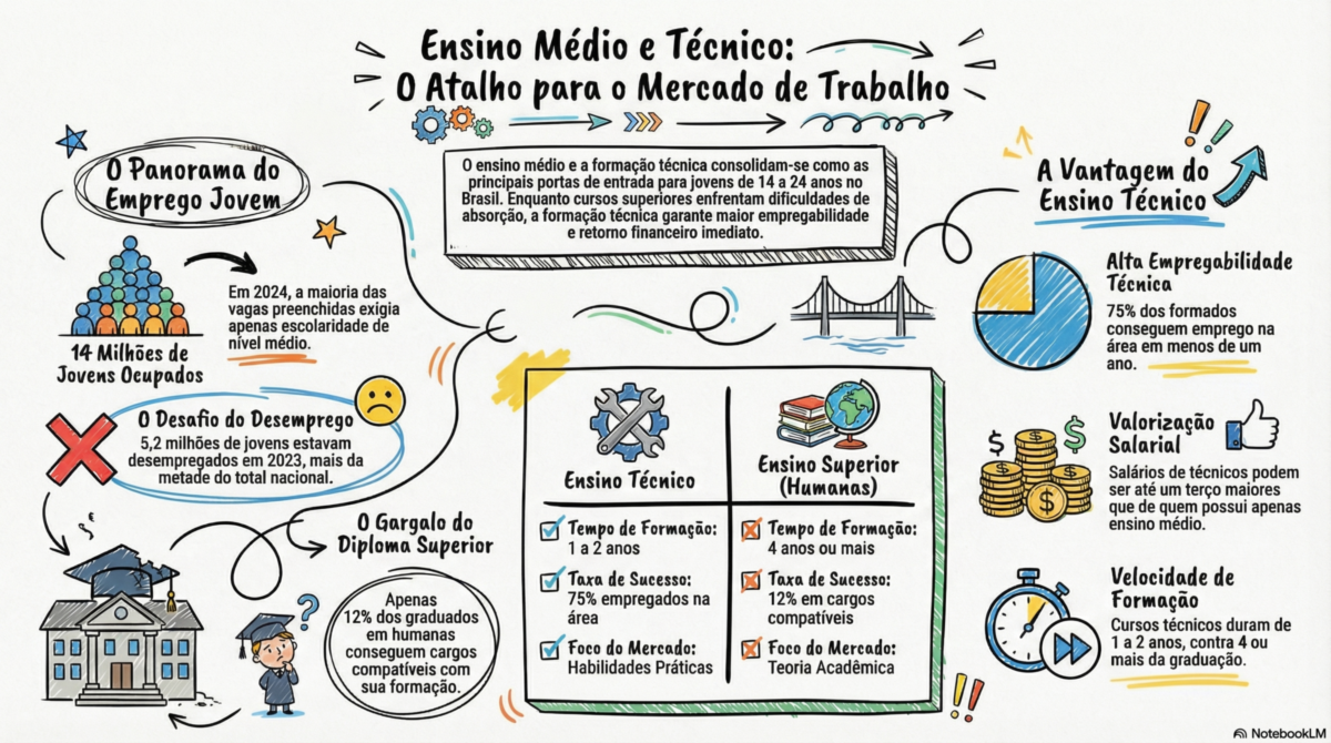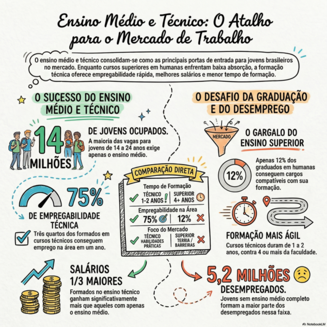 O ensino médio continua sendo a principal porta de entrada para jovens brasileiros no mercado de trabalho. De acordo com dados do IBGE e do Ministério do Trabalho, a maioria dos adolescentes e jovens entre 14 e 24 anos que conseguem emprego têm apenas o ensino médio completo.