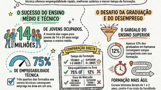 O ensino técnico, que complementa o ensino médio, apresenta índices ainda mais positivos. Três quartos dos formados em cursos técnicos conseguem emprego na área em menos de um ano, com salários até um terço maiores do que os de quem possui apenas o ensino médio. Isso reforça a importância da formação prática e voltada para demandas imediatas da economia.